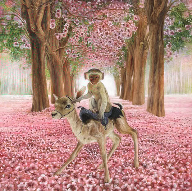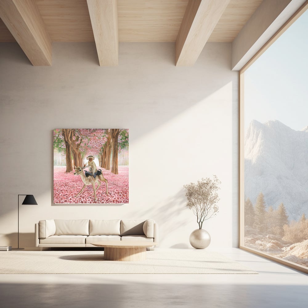 "Fawn Rider" by Jason Wheatley is a whimsical and enchanting painting that transports the viewer into a dreamlike world. The artwork depicts a young monkey perched atop a delicate fawn, riding gracefully through a forest pathway lined with towering trees in full bloom. The canopy and ground are adorned with soft pink petals, creating an ethereal and almost surreal atmosphere.